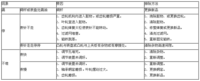 計(jì)量加油槍的故障常為“一漏、二停、三不準(zhǔn)”,現(xiàn)將故障的原因和排除方法列表如下,以供用戶在保養(yǎng)中參考。