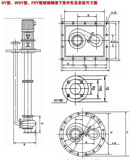 • FSY型泵為立式玻璃鋼液下離心泵,該泵因伸入貯罐,貯槽的深度長短不同,設(shè)計液下深度800mm--3000mm之間任意選擇。