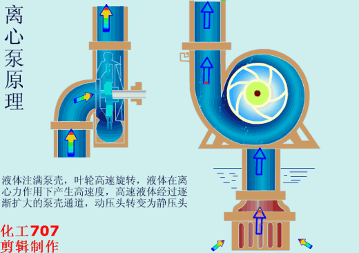 離心泵工作時(shí),液體注滿泵殼,葉輪高速旋轉(zhuǎn),液體在離心力作用下產(chǎn)生高速度,高速液體經(jīng)過(guò)逐漸擴(kuò)大的泵殼通道,動(dòng)壓頭轉(zhuǎn)變?yōu)殪o壓頭。